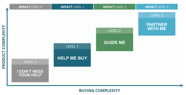 The model categorizes customer impact in four levels, easily identifiable by mapping Product Complexity and Buying Complexity.