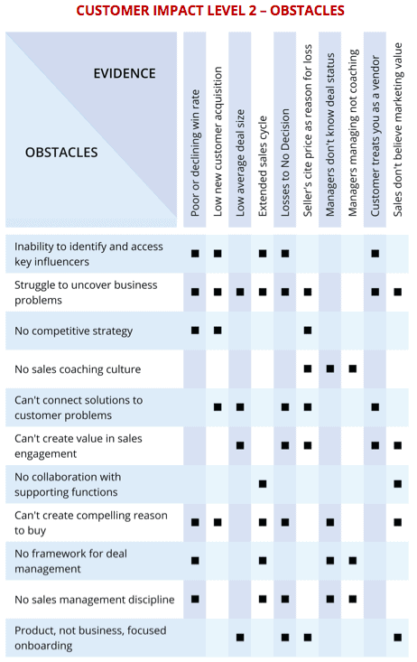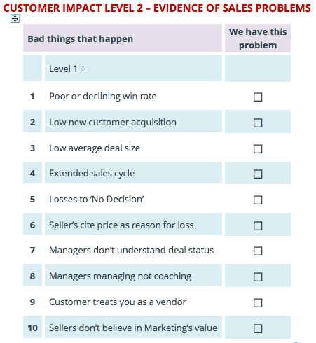 In my last post I described both the symptoms – the Bad Things That Happen – that point to sales problems, and the underlying causes of those problems, in Level 1 sales engagements.