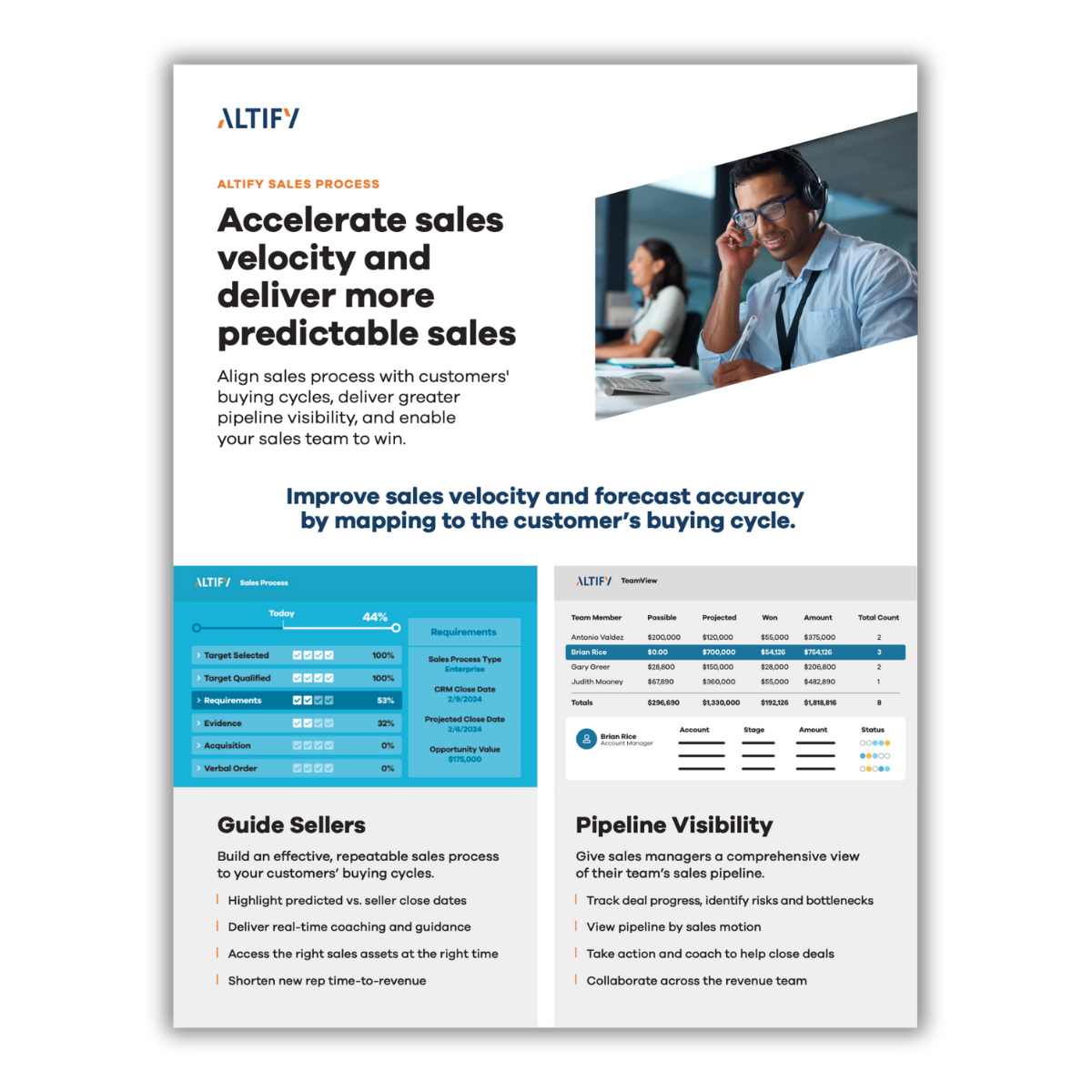 Altify Sales Process Manager guides sellers to follow a structured, proven sales process that improves their ability to deliver a winning outcome for both the seller and the customer. Based on proven industry templates and configured to your business, Sales Process Manager is a visual representation of your sales process, with links to the right content and tools your salespeople need to move opportunities through the sales funnel.