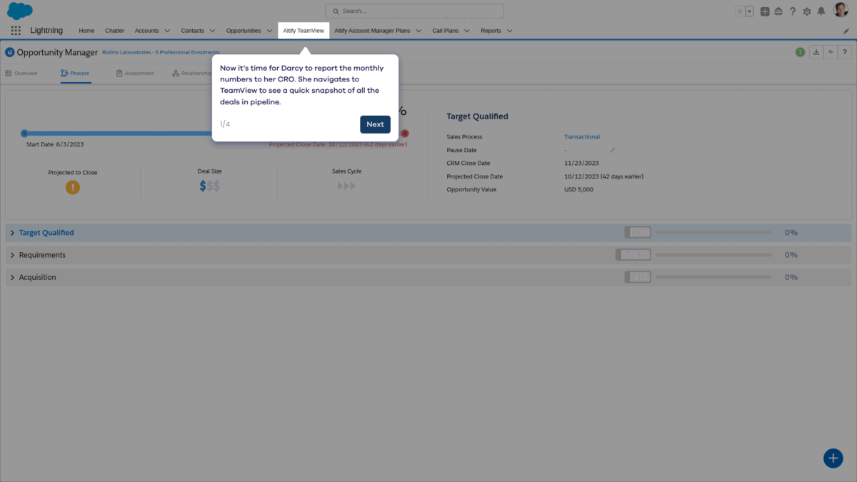 TeamView guides managers toward the exact opportunities that need coaching and the actions sellers must take to progress.